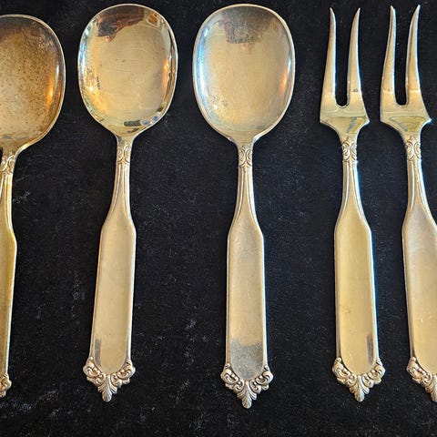 Bestikket er brukt, men fremstår pent og velholdt. Ingen synlige stempler for edelmetall – dette er et dekorativt sett som passer godt til kakebord, selskap, hytte eller som pynt.