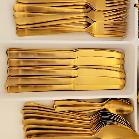 Selger et pent og komplett sett med gullfarget dessert- og serveringsbestikk. Består av flere dessertskjeer, gafler samt serveringsspade og serveringsskjeer, se bilder for innhold og tilstand.
