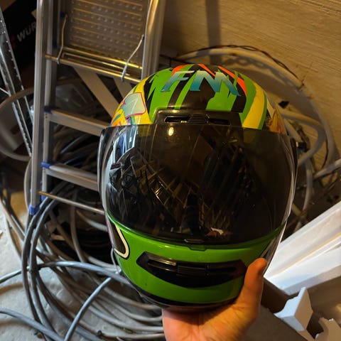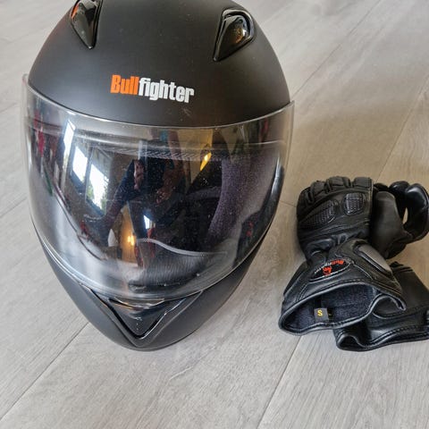 Hjelmen er svart og har integrerte LED-lys foran. Visiret går også opp/igjen med en knapp. Ser ikke brukt ut, vet ingenting annet om den.