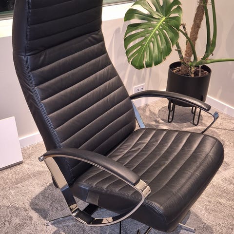 Stilren Bolia Vitesse lenestol i rødt skinn med krombein, selges med fotskammel. Stolen har vippefunksjon som kan låses, samt regulerbar og fleksibel nakkestøtte. Komfortabel å sitte i og fremstår som pen med normal bruksslitasje. Bilder sendes gjerne på forespørsel. Må hentes.