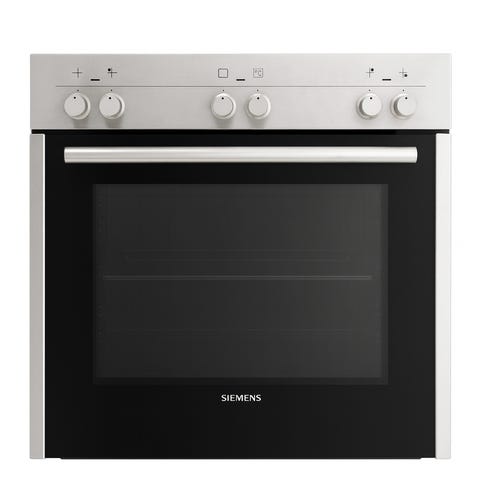 Siemens varmluft ovn, rustfritt stål og glassdør. Ovnens innside er utstyrt med flere nivåer for plassering av rister og brett. Kontrollpanelet har digitale og mekaniske brytere for temperatur og tid.