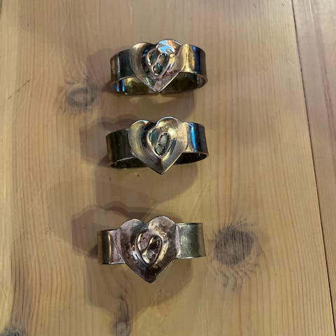 8 stk serviettringer av aluminium. Serviettringene er belagt messing- eller gullfarge innvendig, og utsiden er emaljert i en dempet farge Kr.200
