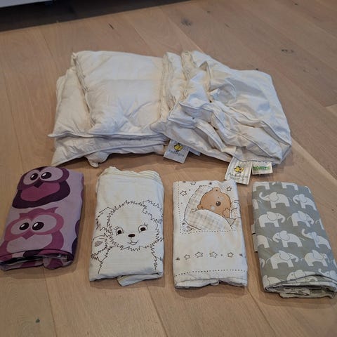- 5 sengesett (dynetrekkstørrelse 65x80 cm): Trampe (Bambi), blåstripete (bamser), blåstripete (Sov søtt lille venn), ugler, dyr/gjenstander