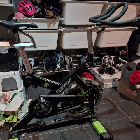 Sportsmaster S650 spinningsykkel med blå og gul farge. Sykkelen har justerbart sete og styre for tilpasning til brukerens høyde og komfort. Designet for innendørs trening og kondisjonsøkter.