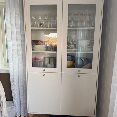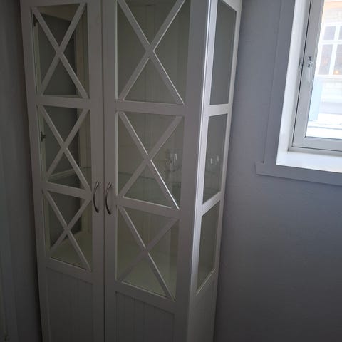 Har 2 vitrineskap fra europris, er uten skader merker. 600 kr pr stykk.