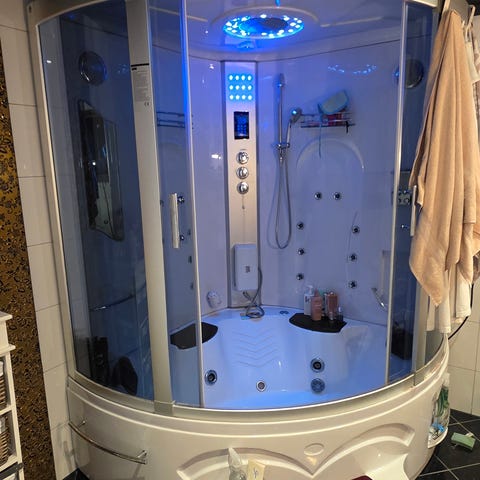 Stort dusjkabinett med massasjedyser og boblebad 120cm x 120cm gis bort, da alle bryterne unntatt vannbryteren sitter bomfast. De bør nok fikses, selv om det fint kan brukes som det er. Jeg opplever ellers at det tar for stor plass på badet mitt.