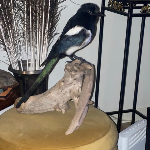 Samling av monterte fugler inkludert forskjellige arter, brukt som dekorative objekter. Fuglene er plassert på individuelle baser og viser detaljer i fjærdrakt og farger. Utstoppet
