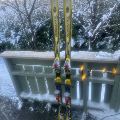 Skiene er hardt brukt, og én binding er ødelagt og mangler.