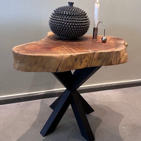 Bordet er 60 cm på det bredeste, og naturkantet. Og 48 cm høyde. Sprekker er tettet med epoxy, og overflatebehandlet med osmo hardvoksolje. Bena er sortlakkert eik. Jeg har video av produksjonen på insta hvis du ønsker å se😊