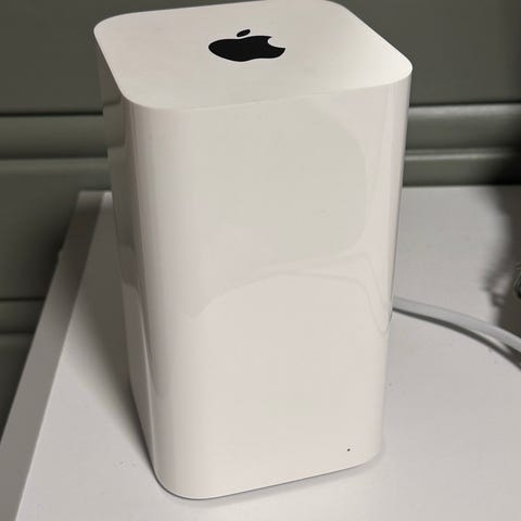 Apple AirPort Extreme Router i hvit farge. Enheten har flere Ethernet-porter og en USB-port for tilkobling av eksterne enheter. Strømforsyning følger med. Modellen er A1354.