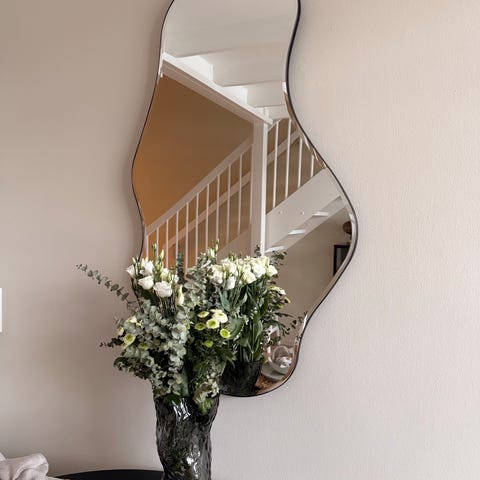 Ferm Living assymetrisk speil med MDF-ramme og messingbelagt finish i gulldekor. Speilet har en bredde på 63,5 cm, dybde på 1,5 cm og høyde på 110 cm. Vedlikehold gjøres ved rengjøring med fuktig klut.