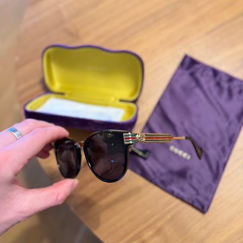 Gucci solbriller for unisex med blå ramme og blåtonede glass. Solbrillene har et firkantet design med Gucci-logo på sidene. Leveres med etui og mykt etui for oppbevaring.