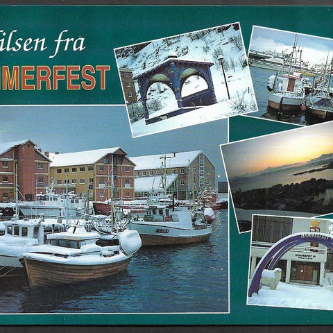 Postkort med bilder fra Vardø vinterstid. Inneholder flere fotografier som viser ulike motiver og bygninger fra området. Meget pent, ubrukt storformat. Se bilder
