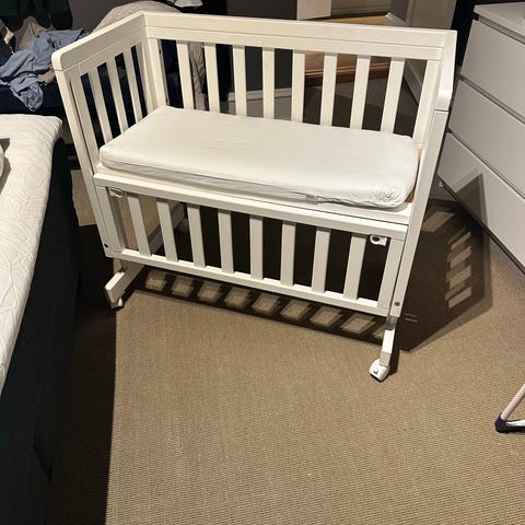 Pent brukt bedside crib fra troll til salgs. Madrass følger med . Ingen flekker og bare noen få bruksmerker på selve sengekanten. Madrassen oppleves som helt ny. Brukt med beskyttelse laken som også kan fås med på etterspørsel.