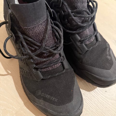 Adidas Terrex Fastshell Mid GTX sko i størrelse 40. Skoene er svarte og laget med vanntett Gore-Tex materiale. Designet for utendørs bruk med god støtte og slitesterk yttersåle.