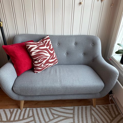 Sofaen er generelt hel og pen, men med noen flekker/merker i stoffet etter normal bruk. Trolig kan disse bruksmerkene fjernes med en rens, sà her kan du sikre deg en kvalitetssofa til en billig penge om du vil ta jobben.