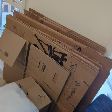 Ca 15-20 flytteesker fra Clas Ohlson str M og L gis bort + en eske med silkepapir og litt bobleplast.