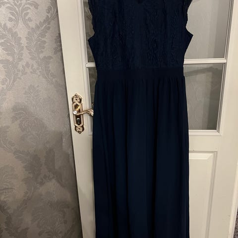 Lite brukt kjole med paljetter. Trykknapper I midjen pluss belte. Går litt over nærne på meg som er 174. Opplever den som normal I størrelse