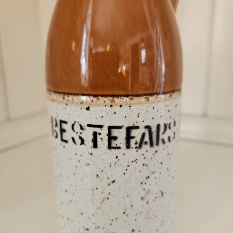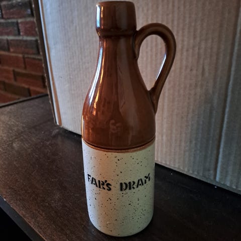 Flaske/ karaffel keramikk # Fars Dram# signert h.16 cm d.10 cm.Flasken er rustikk, hel & pen .