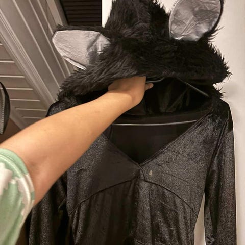 Unisex kostyme med svart og hvit pels, inkludert hode med store blå øyne og matchende potehansker(1stk) . Materialet er kunstig pels. Kostymet er designet for å dekke hodet og hendene.