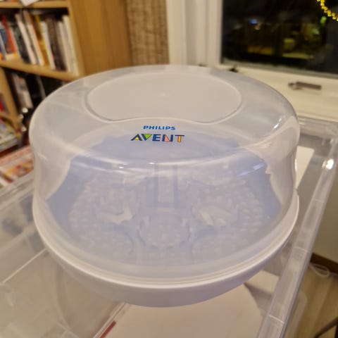 God flaskesterilisator som også kan varme flasker og tine mat. Den kan brukes til sterilisering i mikro eller med det elektriske varmeelementet.
