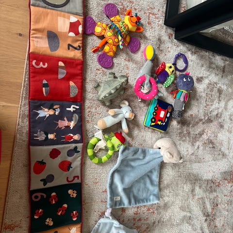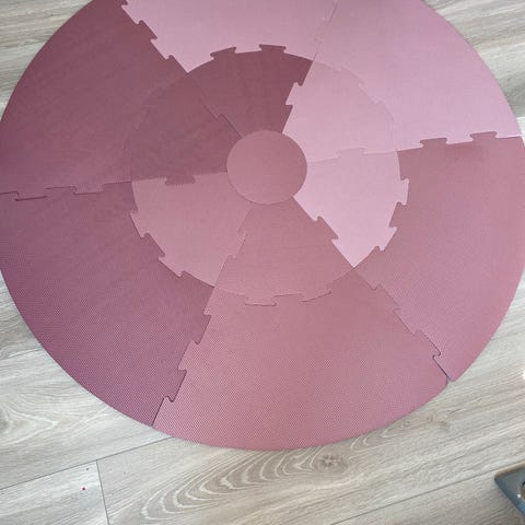 Rund lekematte fra Sebra selges rimelig. Matten er i ulike grånyanser og er pent brukt av to barn.