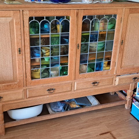 Selger en solid og velholdt sjenk i heltre eik. Sjenken har 2 elegante glassdører med integrert lys i begge skap, samt 4 skuffer.