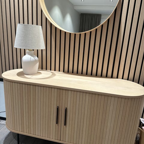 Når sjalusidører er lukket, er hylle synlig bak. Når dørene åpnes lukkes hyllen bak.