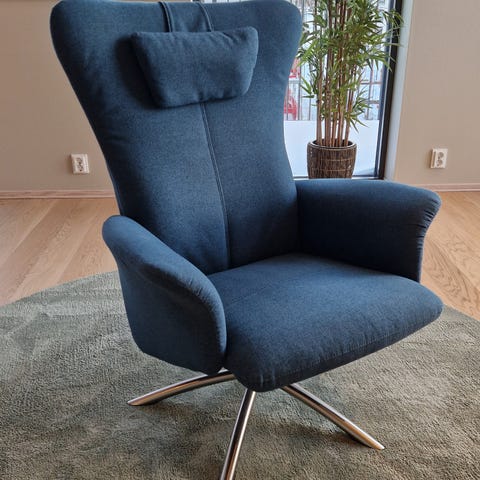 Den avbildede lenestolen med fotskammel er en Baloo-modell fra den norske møbelprodusenten Hjellegjerde. Stolen er kjent for sin unike kombinasjon av skandinavisk design og romslig komfort, og har ofte en sving- og gyngefunksjon.