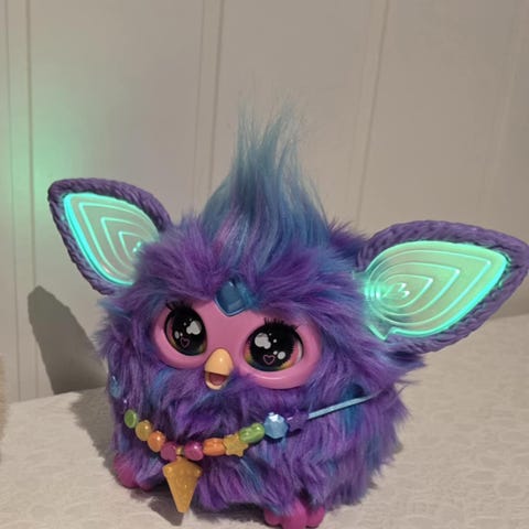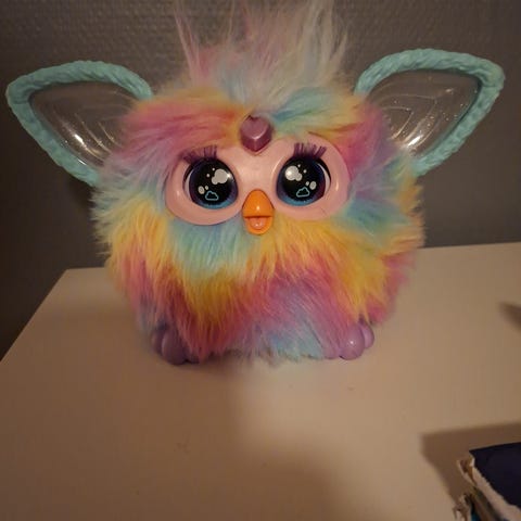 Furby barneleketøy med fargerik pels og dekorative detaljer. Passer for barn og kan brukes til lek og samling.