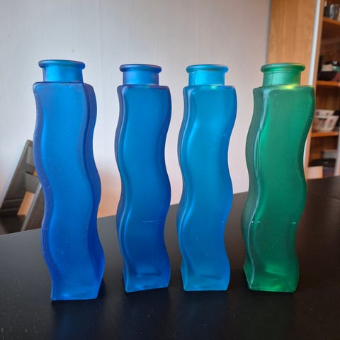 15 flotte, vintage bølgevaser fra IKEA i frostet og klart glass - i regnbuens farger -designet på slutten av 1990-tallet av Sigga Heidis. Flere har fortsatt label fra IKEA under