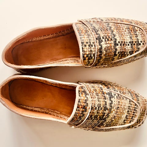Stockholm Design Group ballerinasko i størrelse 39. Skoene er laget av brunt skinn med flettet mønster og har en dekorativ sløyfe på fronten.
