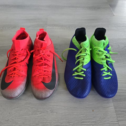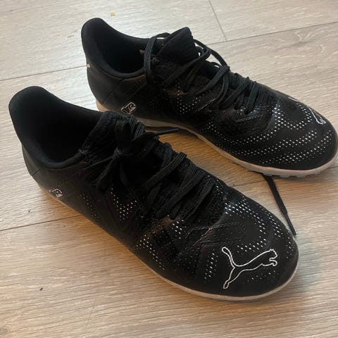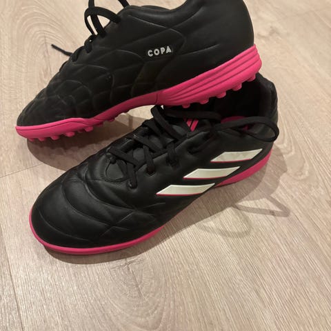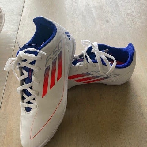 Adidas otballsko i hvit og oransje farge. Skoene har snøring og er designet for bruk på fotballbanen.
