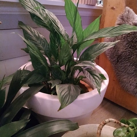 Fredslilje potteplante i mørk grønn plastpotte. Planten har grønne blader og er egnet som innendørs dekorasjon. Noen få merker på et par blader.