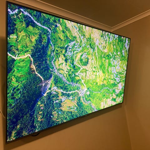 Har hengt på veggen, så foten til tv`en har fortsatt plast på.