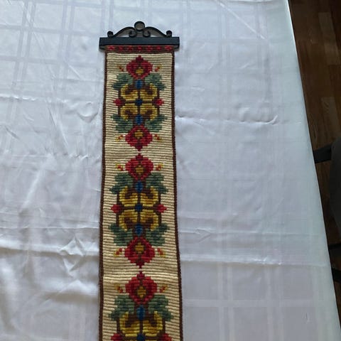 Overskrift: Flott duk i lin med to matchende grytekluter