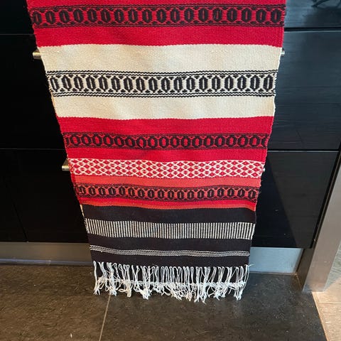 Veggteppe med korssting med teksten 'Velkommen til oss'. Dekorativt tekstil med fargerike blomster- og mønsterdetaljer. Passer til veggdekorasjon i hjemmet. Teppet er 70x50 og oppheng i tillegg.