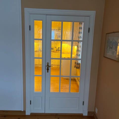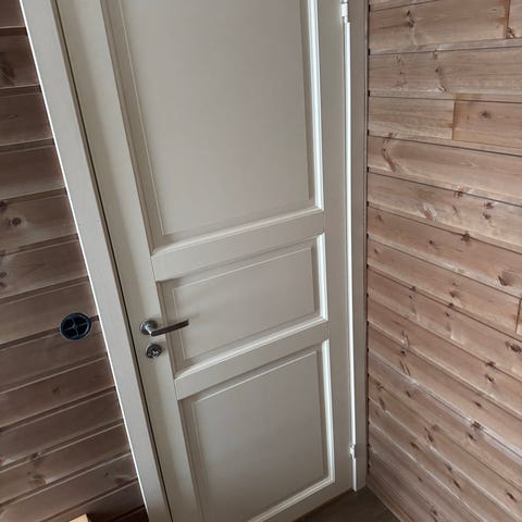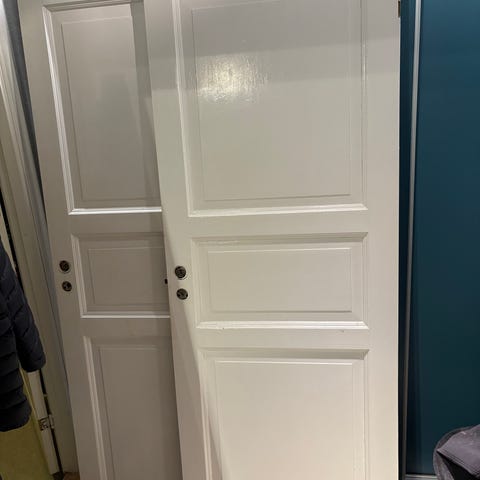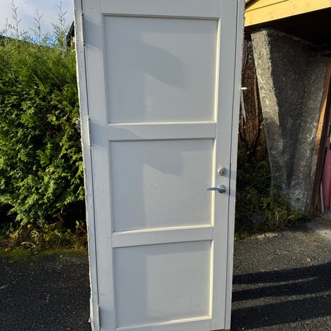Selger 4 hvite tredører (med karm) med klassisk paneldesign i treverk. Døren har et tradisjonelt utseende med flere innfelte paneler og en mørk dørvrider. Egnet for innvendig bruk i bolig.