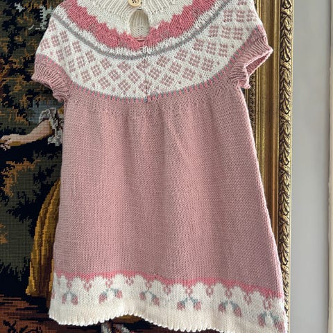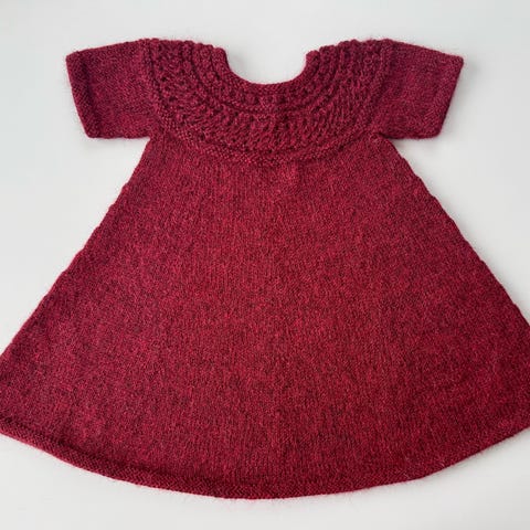 Nydelig kjole i flott, lilla farge. Kjolen har lange ermer og fine rysjer på skuldrene.