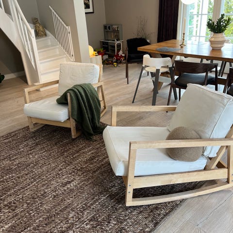 Denne klassiske gyngestolen søker nytt hjem fordi huset den bor i har fått flere barn og mindre plass til fine designstoler. Stolen har vært en del av familien i mer enn ti år, og ble i sin tid kjøpt på Illums bolighus i Oslo. Nypris i dag er ca. 8 000,-. Den ble i sin tid, som nykjøpt, brukt som forklaringsmiddel for å slippe bot på bussen - noe som virket! Vi kan ikke love at slik flaks følger med til neste kjøper, men håper den finner et nytt hjem med hjerterom. Benene bærer preg av at vi på et tidspunkt fikk valp i hus, men utover det er den helt som ny!