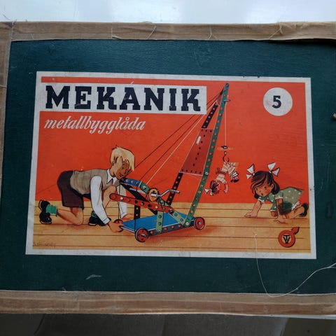 Tekno mekanisk byggesett med metallkomponenter, skruer og hjul. Settet inneholder ulike metallbiter og deler som kan brukes til å bygge mekaniske modeller eller konstruksjoner. Passer for teknisk og mekanisk lek og læring.