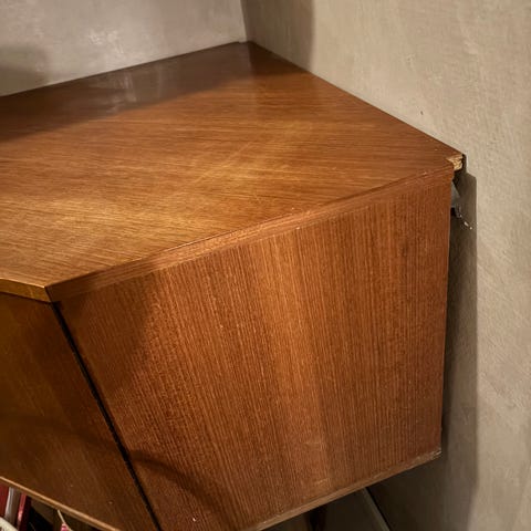 Denne gullbiten av et teakskap må dessverre føytte grunnet plassmangel. Den er kjøpt slik den nå selges, med de bruksmerker som er. Skyvedørene fungerer som de skal, og inni er det overraskende god plass! F.eks. til brettspill, leker eller som et lite barskap?