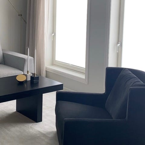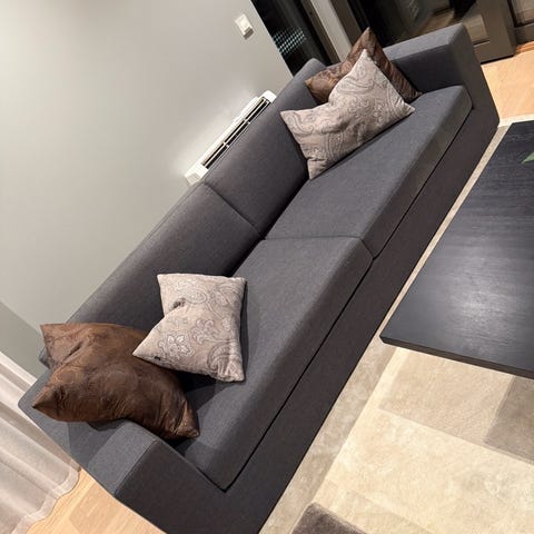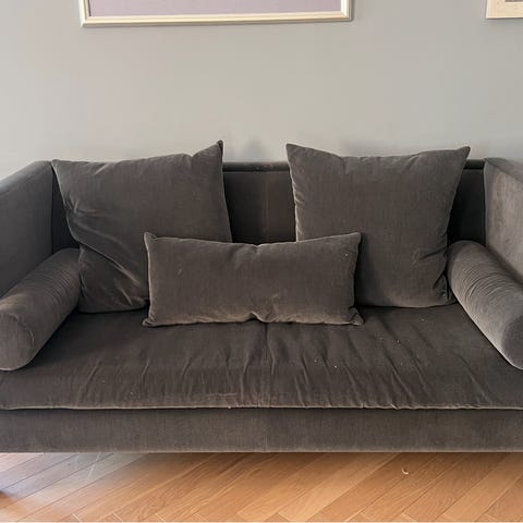 Pen Maddox sofa fra Slettvoll selges for 8000kr. Sofaen er designet av Hennie interiør. Fargen er dyp grå med mørke eikeben. Sofaen står i et røyke og dyrefritt hjem.