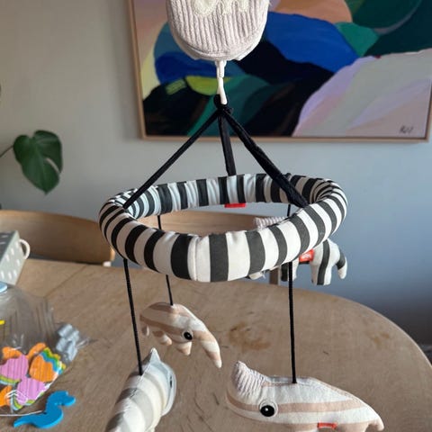 Done By Deer Uro med beroligende vuggemusikk. Den er opptrekkbar og dreier rolig rundt. Kan festes på baby-seng og grind, vi har brukt den på stellebord. Kan hentes på Hagan, Nittedal.