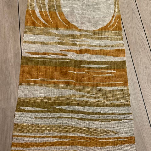 Retro og jordnære farger. Håndvevd ullgarn, i veldig fin stand. Mål: 74x108cm. Har innsydd trepinne for enkel oppheng.