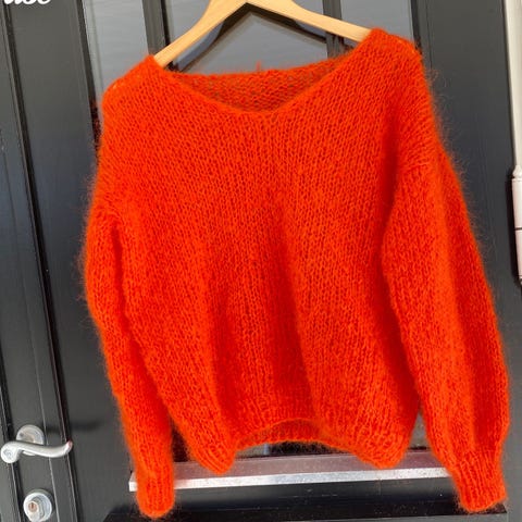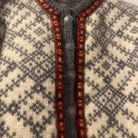 Selger unna en hjemmestrikket rød ullgenser/cardigan. Den er veldig varm og god å ha på seg! I tillegg har den 4 knapper som gjør at den både ian fungere som en genser og en cardigan/jakke!