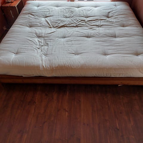 Har noen stygge merker som jeg vil tro at man kan pusse bort, i tillegg til et hakk i treverket. Kan bli fin igjen dersom man ønsker et prosjekt:) Vil ikke syns med madrass oppå.