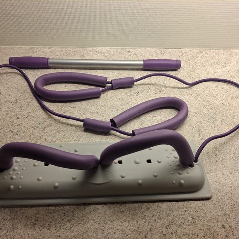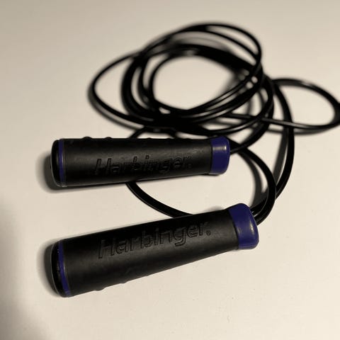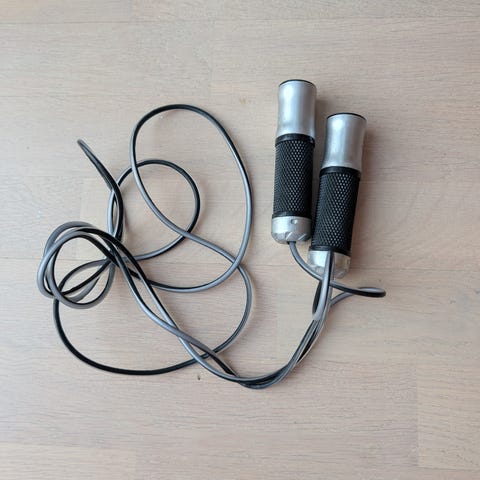 Hoppetau med tellefunksjon, oransje håndtak med grepvennlig design, og tau med grønn og hvit flette. Egnet for trening og hopping.