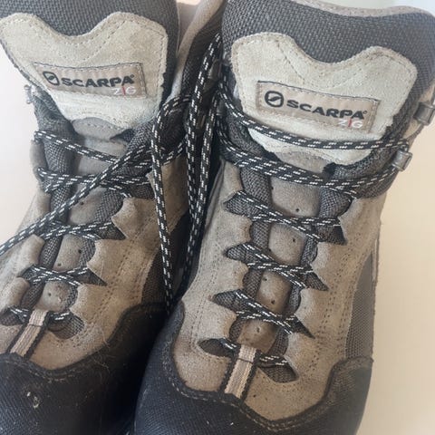 Scarpa tursko i størrelse 43 1/3 for herre. Fargen er beige med oransje detaljer. Laget i numbuk. Egnet for turgåing og utendørs bruk. Vibram såle