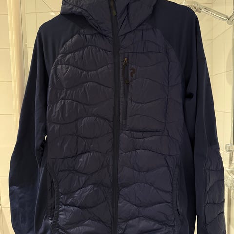 Peak Performance jakke i størrelse L, marine blå. Jakken har hette. Fin som mellomlag eller som en lett jakke. Selges da jeg har for mange jakker i samme kategori.